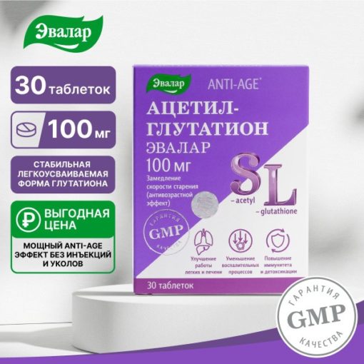 Evalar Acetyl-Glutathione 100mg: Powerful Anti-Aging Antioxidant & Detox Supplement (30 Tablets)