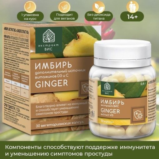 A dietary supplement providing additional Vitamin D3 and C. Each capsule contains 100mg of standardized ginger root extract (Zingiber officinale), 99mg of Vitamin C, and 180 IU of Vitamin D3 – an optimal bioactive complex for immune support, especially during cold and flu season. Ginger’s key active component, gingerol (5mg per capsule), combats free radical damage, boosting antioxidant status and strengthening the body’s defenses. Gingerol’s anti-inflammatory properties alleviate cold symptoms like aches and fatigue. It also targets areas of the brain and gastrointestinal tract responsible for nausea, helping reduce nausea from various causes (motion sickness, illness). Vitamin C (Ascorbic Acid) provides 165% of the recommended daily intake (within safe upper limits), offering general stimulation, boosting immunity and aiding tissue regeneration. Vitamin D3 (Cholecalciferol) provides 90% of the recommended daily intake, crucial for calcium and phosphate metabolism, supporting skeletal health, calcium absorption, and bone mineralization. Increased Vitamin D3 needs are common during menopause. Vitamin D3 also plays a key role in immune function, with studies suggesting it can reduce respiratory infections. Ginger Extract VIS utilizes vegetarian Vcaps® from Capsugel, a global leader. These plant-based capsules (cellulose from pine) are titanium dioxide-free, preservative-free, gluten-free, and GMO-free. Also search for: cold and flu vitamins, immune support capsules.